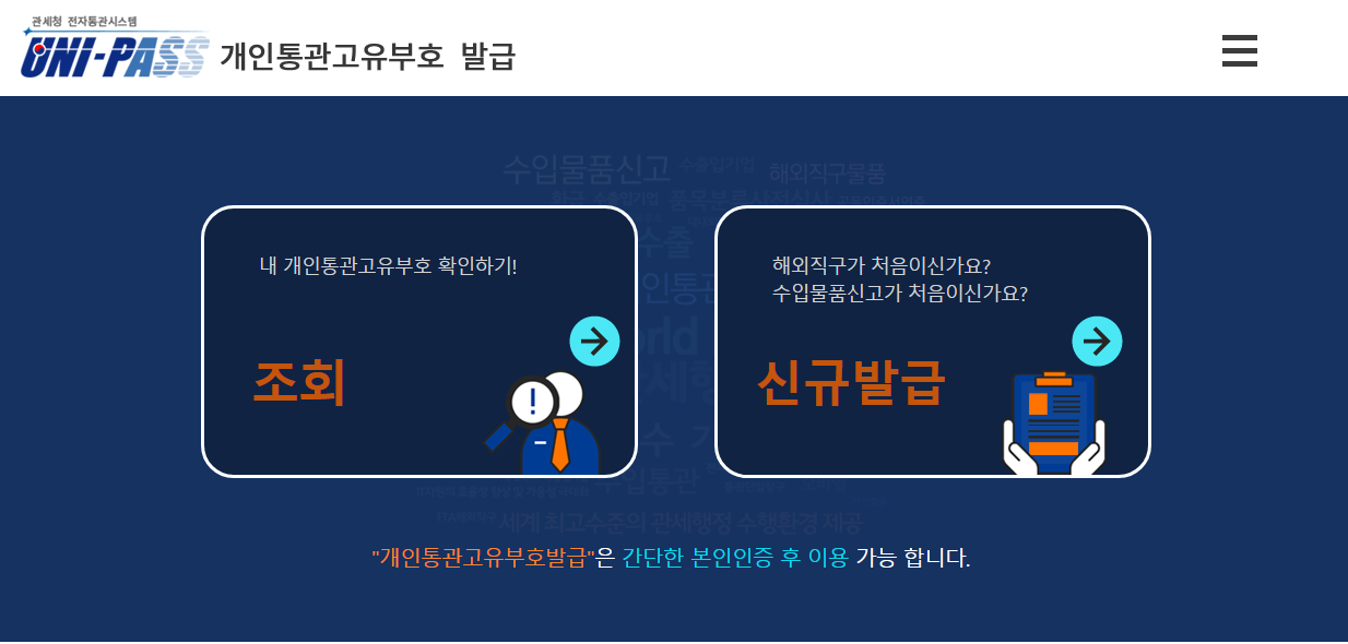 관세청 시스템(https://unipass.customs.go.kr/persIndex.do )에 접속해서 아래 사진과 같은 화면이 나오면 "신규발급"을 누르고 본인인증을 진행하면 쉽게 만들 수 있습니다. 인증방법으로는 핸드폰, 공인인증서/금융인증서, 간편인증(페이코,삼성패스,카카오,PASS,KB모바일인증서)가 가능합니다.