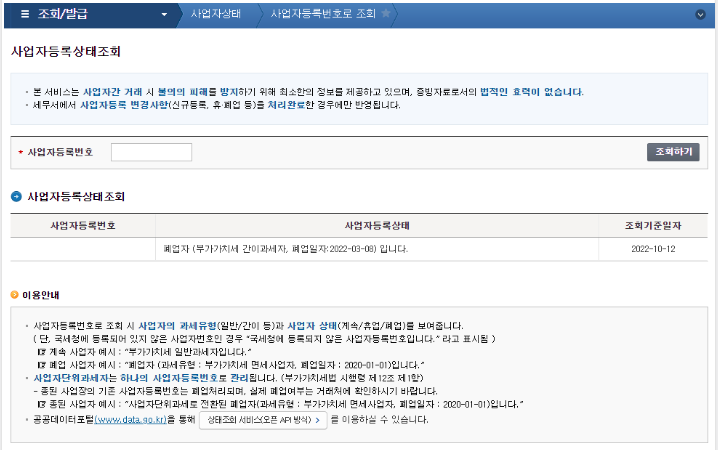 사업자번호를 입력 후 조회하기를 누르면 아래와 같이 상태가 나타납니다. 폐업한 제껄로 조회했더니 아래와 같이 폐업일자가 나타납니다. 이렇게 나온다면 거래를 하면 안됩니다.