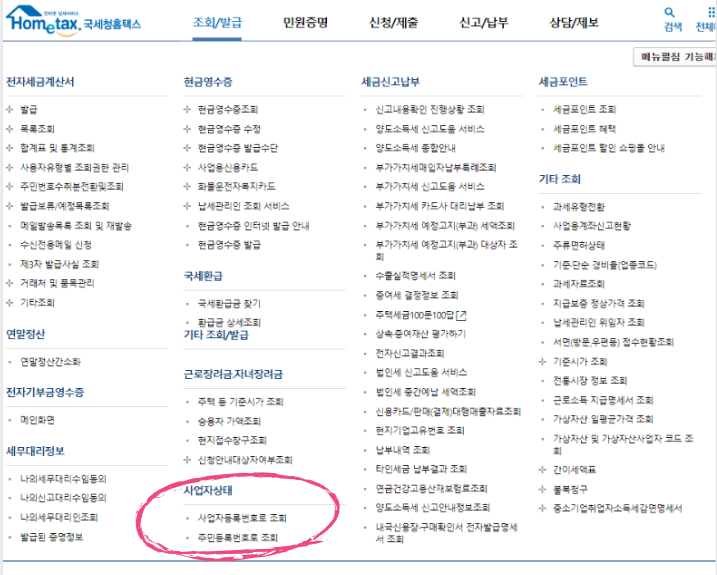 홈텍스로 들어갑니다. 로그인 안해도 가능합니다. 조회/발급 탭을 누르고 스크롤을 아래로 내리면 맨 아래에 사업자상태가 있습니다. 여기서 사업자등록번호로 조회를 누릅니다.