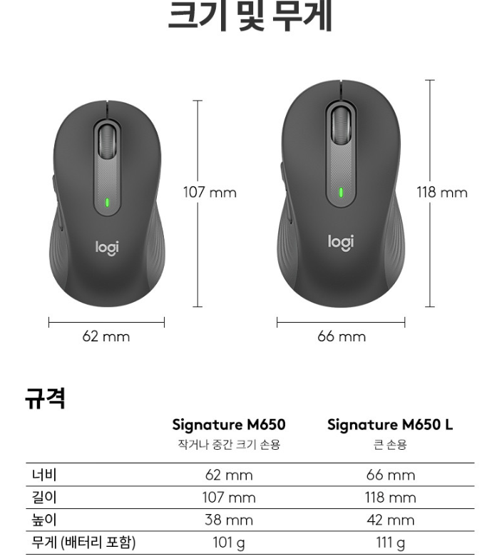 지금 사용하는 마우스 패드에 손자국으로 반들거린다면 이제품 구매하세요. 저도 이전에는 그랬습니다. 현재는 깨끗합니다. 이 로지텍 마우스는 M650과 M650L 제품이 있습니다. 제품 설명으로는 손이 19cm 이상이면 L을 사용하라고 합니다. 저는 그다지 손이 크지 않습니다. 그런데도 손에 잡히는 맛이 있는 제품입니다.