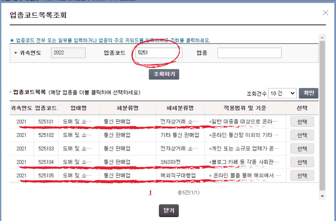 "업종코드""5251"를 입력하면 아래와 같이 도매 및 소매가 뜬다.