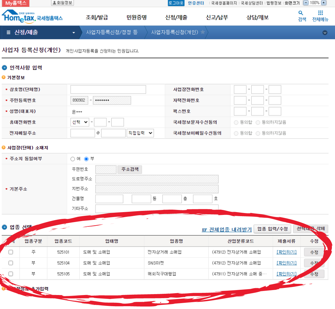 "사업장 주소"는 주소지 동일을 선택하면 자동적으로 본인 주소가 선택됨.