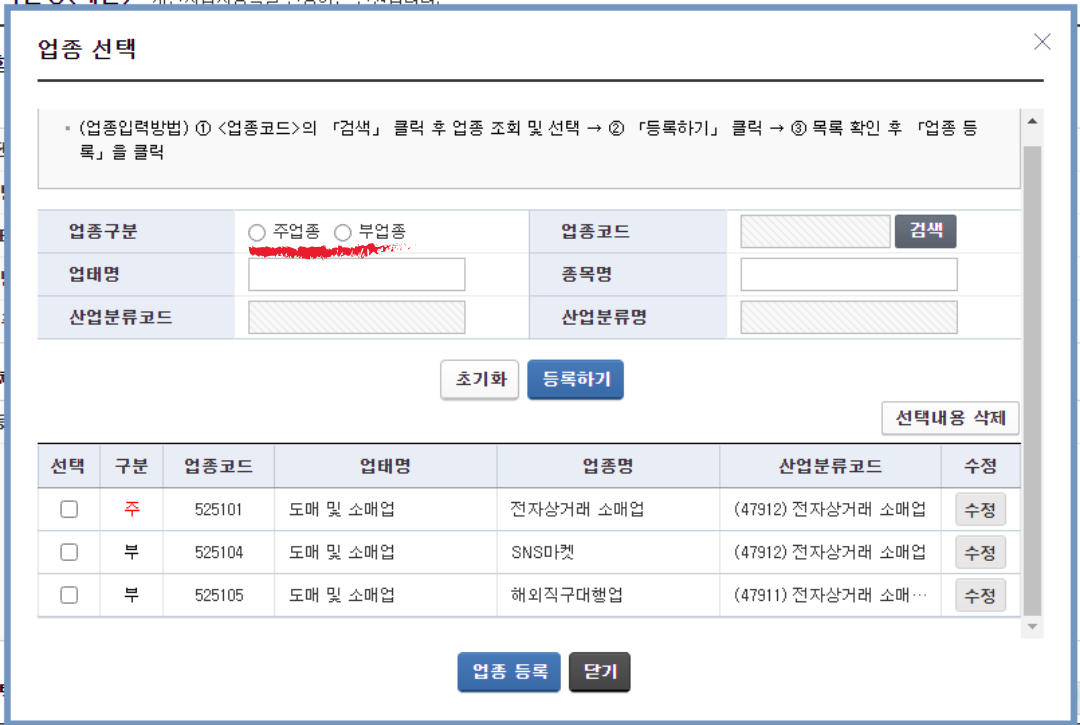 주업종, 부업종을 골라가며 1개씩 등록하면 된다.