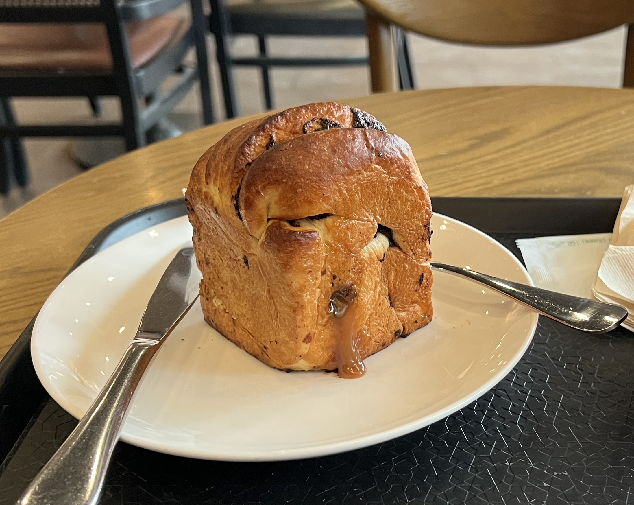 인제 단점을 얘기해보자면 이빵의 장점인 캐러멜이 문제입니다. 아래 사진처럼 흘러서 차에서 손으로 먹을 수가 없어요. 기존 밤콩 달콩은 손으로 찢어먹는 재미가 있었는데... 이건 불가합니다. 혹시나 찢어먹을까 봐 그랬는지 물티슈도 2장이나 줬습니다. 그리고 캐러멜을 나중에 집어넣는 것인지 뭉쳐있습니다. 먹다 보면 캐러멜 없는 빵을 먹을 수 있습니다. 가를때 잘 갈라서 발라 먹어야 합니다. 다 먹고 보니 접시가 엉망진창이 되어있습니다.