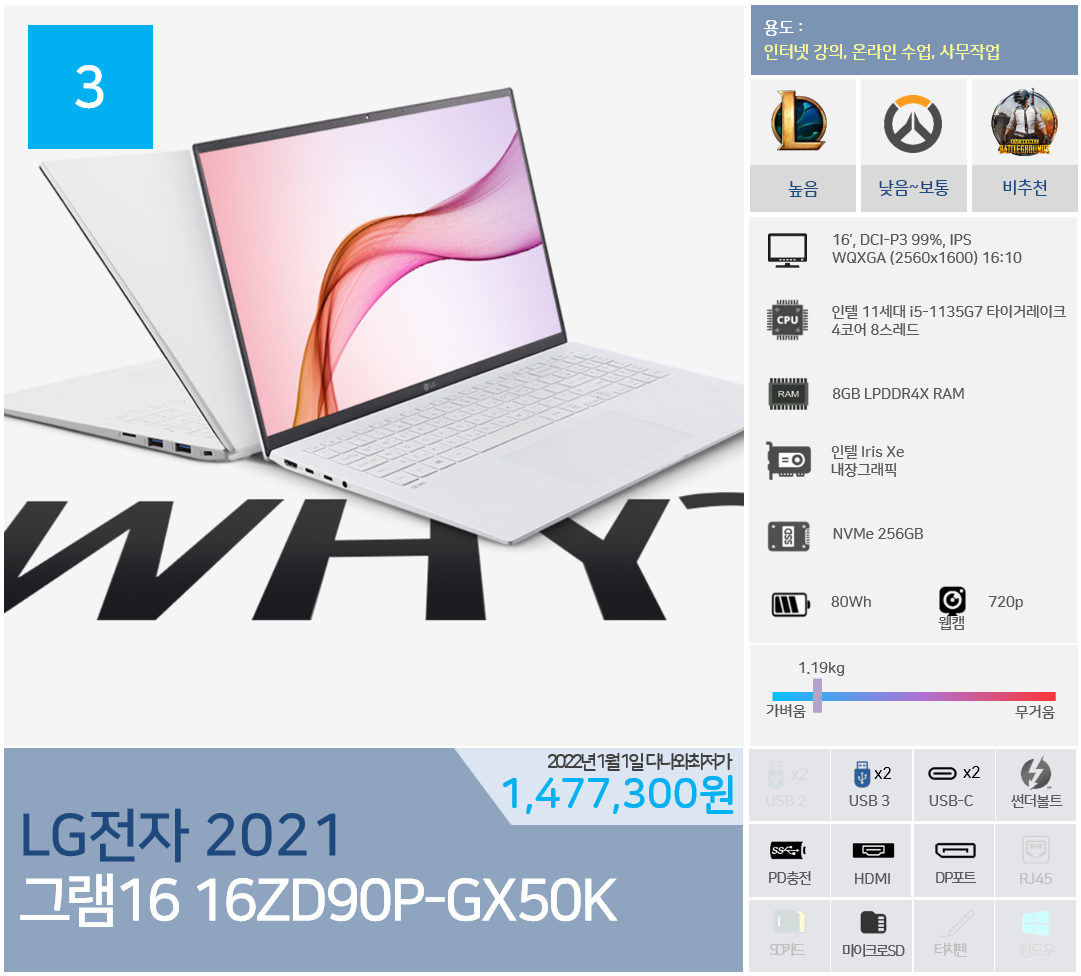 초경량 노트북의 대명사인 '그램'은 2021년에도 여전히 건재함을 과시했습니다. LG전자 2021 그램16 16ZD90P-GX50K (현재 최저가: 1,528,970원) 이 바로 그 주인공이에요.