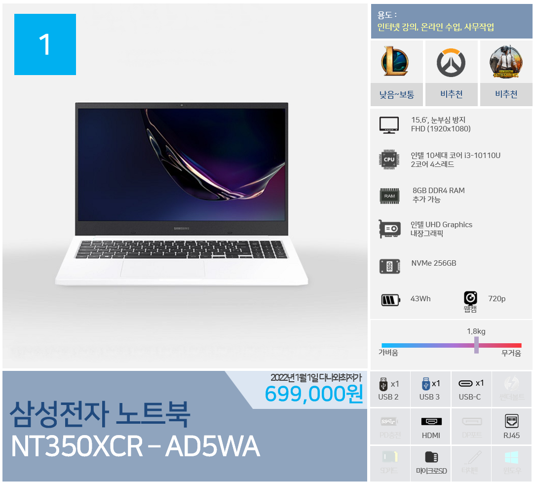 AS가 편리한 대기업 노트북이면서 저렴한 가격, 일상 용도로 무난한 성능까지 보유한 삼성전자 노트북 NT350XCR-AD5WA (현재 최저가: 687,970원 )입니다. 2020년 7월에 출시하여, 1년이 넘는 시간 동안 많은 사람들의 관심을 받았던 제품이죠.