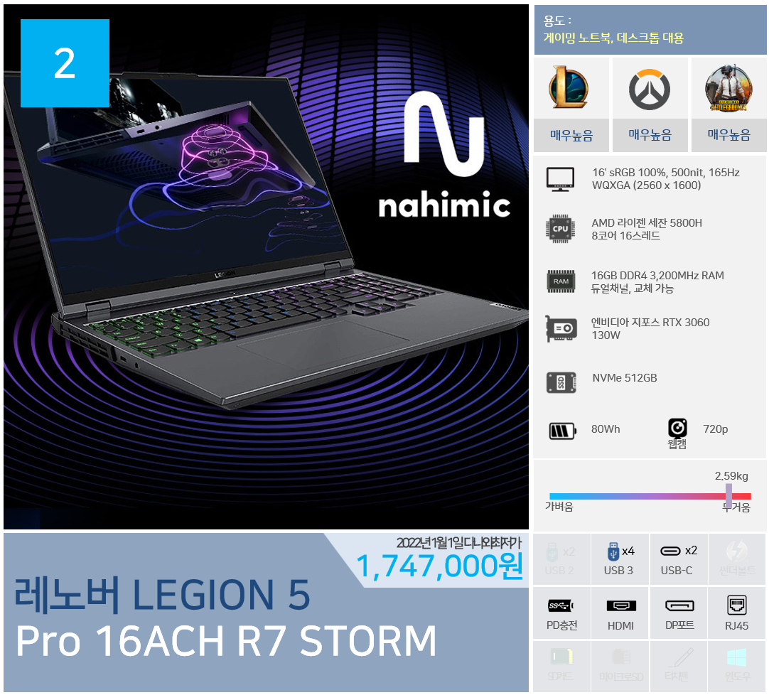 레노버 LEGION 5 Pro 16ACH R7 STORM(현재 최저가: 1,745,000원)은 2021년 게이밍 노트북 시장을 뒤흔들었다고 해도 과언이 아닙니다. 강력한 성능은 기본이고, 최상급 품질의 디스플레이, 최고 수준의 편의사양을 모두 탑재하면서도 가격이 합리적이었기 때문이죠.