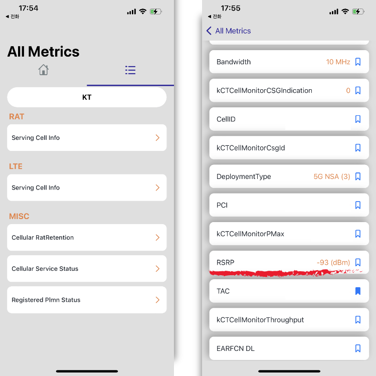 아이폰 수신감도 확인방법을 알려드리겠습니다. 저의 경우 5G폰에 LTE요금제를 사용하고 있습니다. 근데 요즘 와이파이가 아니면 속도가 늦고 버벅이는 거같아서 수신감도 확인을 했습니다. 기본적으로 안테나 모양은 정확한 수치를 알 수 없습니다. 이 방법을 통하면 정확한 수치를 알 수 있습니다. RSRP(Reference Signal Received Power) 내폰의 수감도를 숫자로 보는 방법을 알려드리겠습니다.