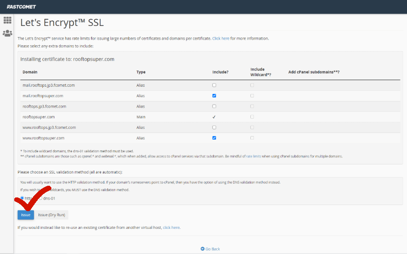 Domain 옆에 보시면 Include? 가 보입니다. 빈간을 다체크해주시면 됩니다. 그리고 아랫쪽 파란색ISSUE를 클릭하고 나가면 성공했음을 알려줍니다.