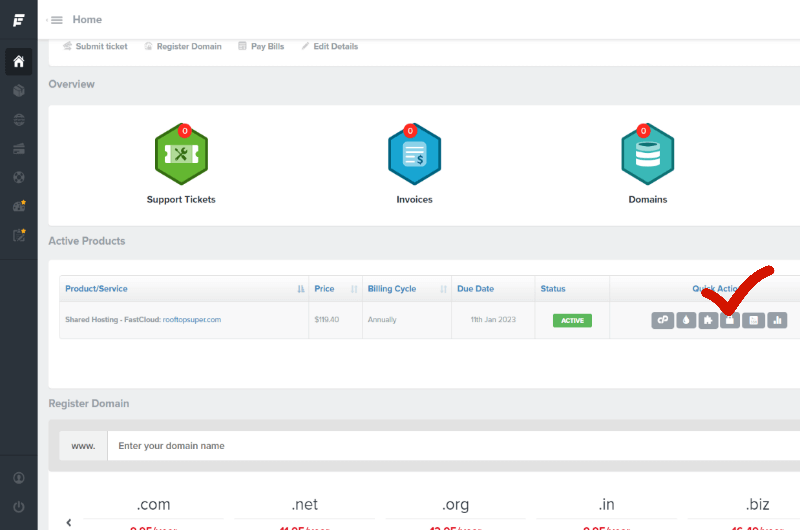 Fastcomet에 로그인을 하면 본인 관리페이지가 나타날 것입니다. 그럼 아래 그림과 같이 자물쇠모양을 클릭하고 들어갑니다. 아래에 나타나지 않는다면 도메인을 구매하지 않았거나 연결을 하지 않았기 때문입니다. 혹시 타 사이트에서 구매한 도매인을 연결하는 것이라면 그림아래의 글에서 진행하고 오시기 바랍니다.