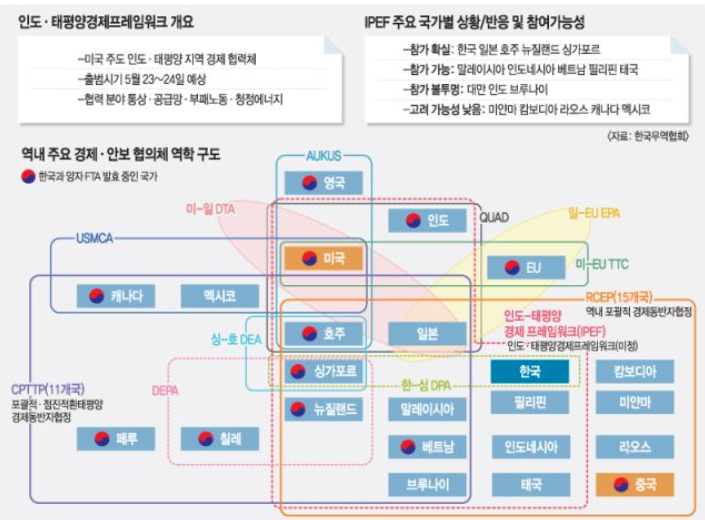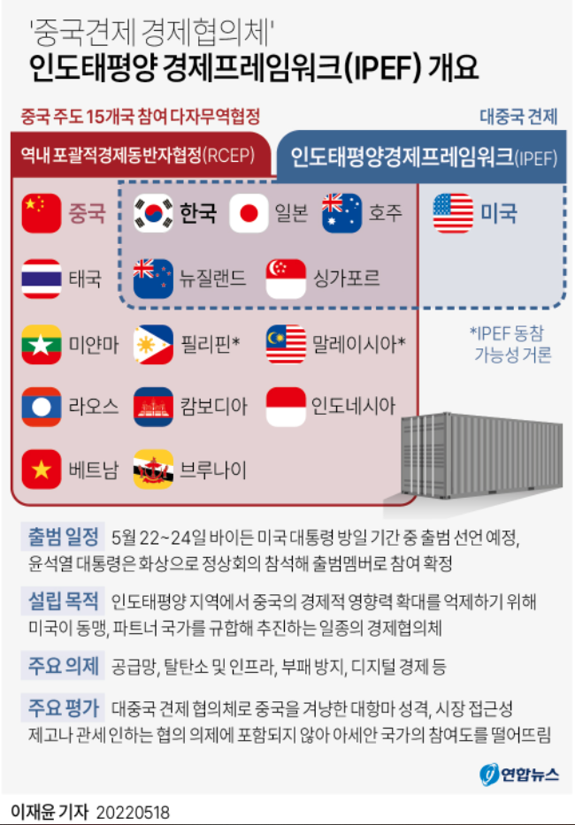 중국이 주도하는 RCEP에 대항하기 위해서 미국 주도하에 만든 경체연합회입니다. 우리나라도 출범 회원국으로 참여하기로 했습니다. 참여로 인해 한미간의 경제안보동맹이 강화되고 공급망의 다변화, 안정화가 될 것으로 기대하고 있습니다. 주 교역품으로는 반도체, 자동차, 디지털 경제, 탈탄소, 청정에너지 등 단순한 제조품에 국한 되지 않는 경제연합이라고 보시면 됩니다.