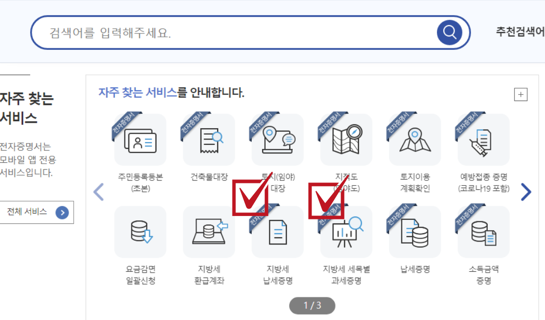 이것도 정부 문서이기 때문에 위의 2가지 방법으 가능합니다. 정부24의 경우 비용이 무료입니다. 하지만 프린터가 있어야 한다는 사실..... PDF로 출력이 안되니 돈버리지 마시기 바랍니다. 정부 24는 아래화면의 표시된데로 들어가서 진행하시면 됩니다.