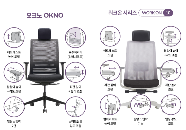 두 제품은 다양한 기능을 가지고 있습니다. 오크노와 워크온 10은 성능적인 기능은 비슷합니다. 큰 차이가 나는 것은 틸팅기능입니다. 오크노의 경우 틸팅강도를 조정할 수 없습니다. 본인의 체중에 따라서 졎혀짐이 다릅니다. 워크온의 경우 틸팅강도를 조절가능합니다. 그 외의 차이점은 아래와 같습니다.