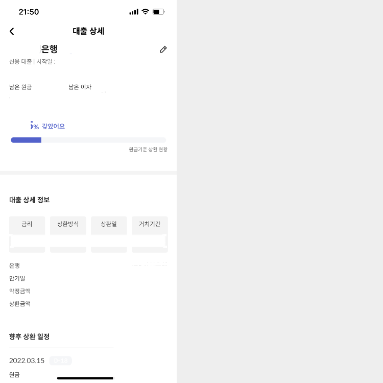 자세히를 누르면 개별적인 항목별로 내역ㅇ르 보여줍니다. 스크롤을 내리면 은행별로 얼마가 남아있는지 확인할 수 있습니다. 또한 선택을 해서 들어가면 현재 금리, 상환일, 얼마큼 갚았는지 확인할 수 있어 좋습니다. 참고로 간혹 대출정보가 안 들어간 내역이 보이는데요. 그 은행에 들어가서 대출정보를 확인해서 입력해주시면 됩니다.