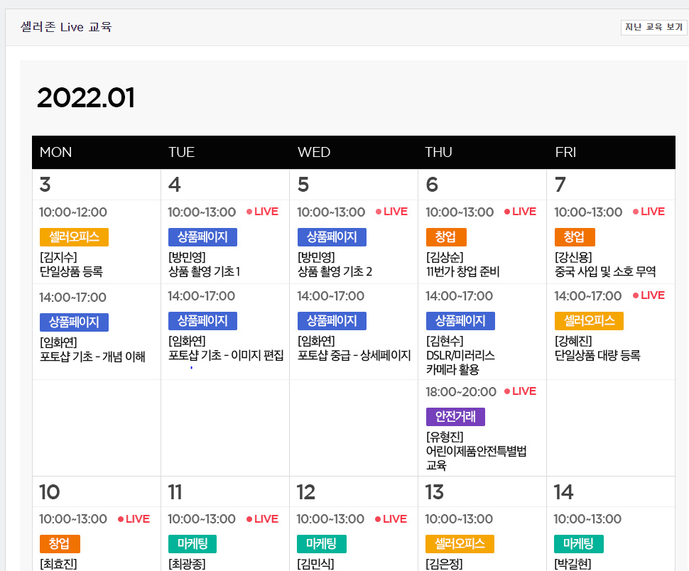 라이브강의가 매달/매일 있습니다. 시간이 가장 졸리고 바쁜 10~13시, 14시~17시입니다. 시간마다 교육내용이 다르고 일정표가 있습니다. 강의 내용도 셀러 페이지 이용방법만 있는 게 아니고 마케팅, 세무, 페이지 만들기 등 다양하게 있습니다. 저는 오늘 보기 시작했어요. "지난교육보기"가 있어서 녹화영상을 볼 수 있습니다. 근데 최신 영상이 바로바로 올라오는 것은 아닌 거 같습니다. 최신이 12월 27일이더라고요.