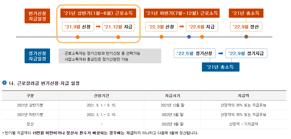 21년 상반기는 끝났고 21년 하반기에 대한 반기 신청이 가능합니다. 신청일은 22년 3월 1일 부터 15일까지이며 지급은 22년 6월 말에 받으실 수 있습니다. 혹시나 휴직으로 인해 잊어버리셨다면 22년 5월에 21년도 총소득에 대한 정기신청을 진행하시면 됩니다. 저도 생각해 보니 백수라 신청을 안 하고 있었네요. 다들 조금이나마 보탬이 되도시길 바랍니다.